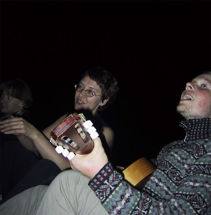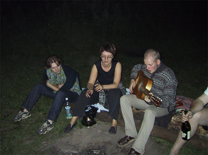 - Ну а в это время на бревнах пели, слегка пили, устало смотрели во тьму, снова пели, подпевали, уходили в процесс с головой, сидя возле потухающего огня.