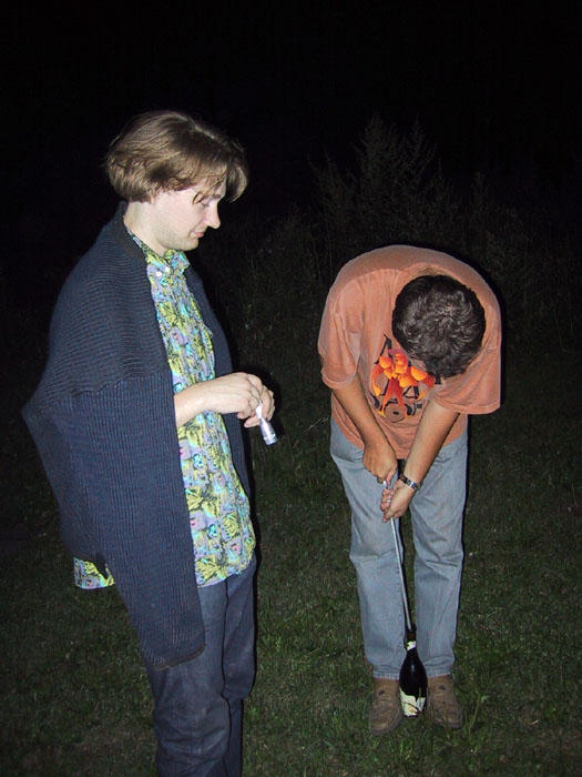 - Затем настало время матадоров. Это не так просто - открыть бутылку шампуром. Поэтому подоспела помощь. Сначала пассивная, затем - активная. Вдвоем побороли.